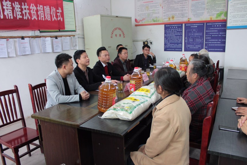 2018年10月22日,四川金鑫工程测绘有限责任公司响应威远县工商联“万企帮万村,精准扶贫”的号召,前往新店镇文丰村对26户困难群众进行扶贫捐赠活动。在新店镇倪先进镇长(右1)的陪同下,工商联倪成主席(左1),李正戈副主席,金鑫测绘总裁史忠云先生(图中),总经理余梦龙先生(右2),党支部书记王笃先生一行人,前往困难户家中,将本次捐赠的电视机,大米,食用油等捐赠物资亲手发放到困难群众手中。群众对此次活动非常开心,也感谢政府的关怀和企业的帮助,更感激在中国共产党领导下的新中国政策为老百姓带来的幸福生活。